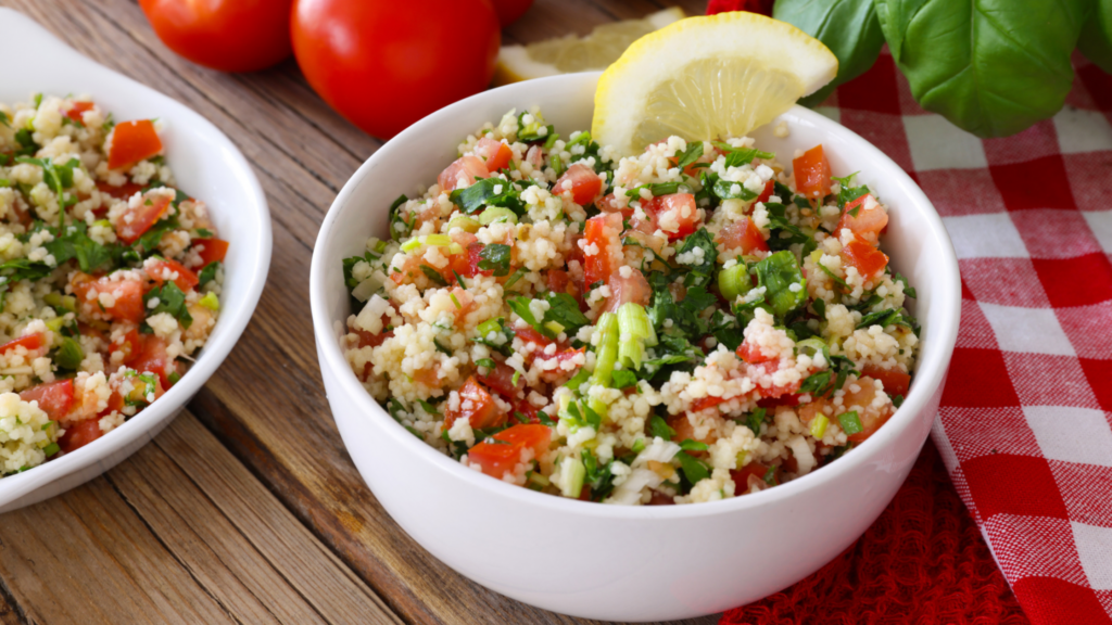 Sałatka z pietruszki, pomidorów, cebuli oraz bulguru (gotowanej pszenicy), wszystko doprawione sokiem z cytryny i oliwą z oliwek. Tabbouleh jest lekkie i orzeźwiające, idealne na gorące dni.