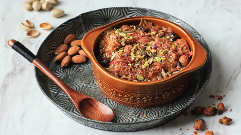 Egipski deser z listkowanego ciasta, mleka, cukru, orzechów i rodzynek, przypominający pudding.